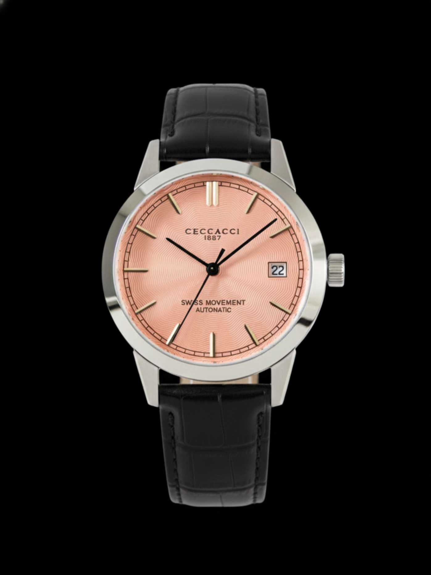 An elegant 36 mm timepiece designed to complement both him and her, this watch pays tribute to the refined charm of the 1950s and 1960s. Its domed hesalite crystal evokes the sophistication of vintage horology, while the Swiss-made ETA movement ensures enduring precision and reliability. The handcrafted guilloché dial captures light with exquisite texture, and the genuine leather strap completes the ensemble with timeless elegance.