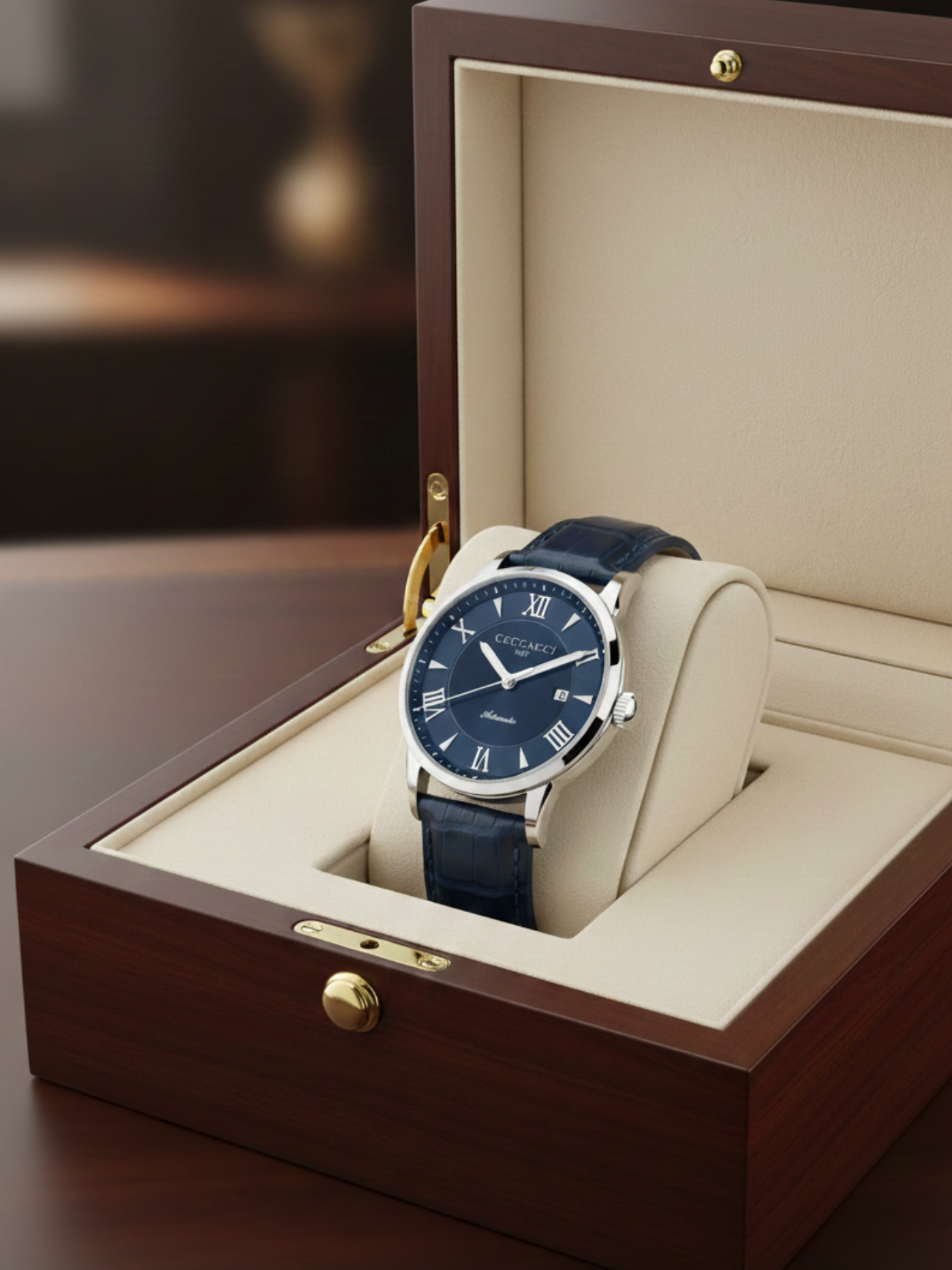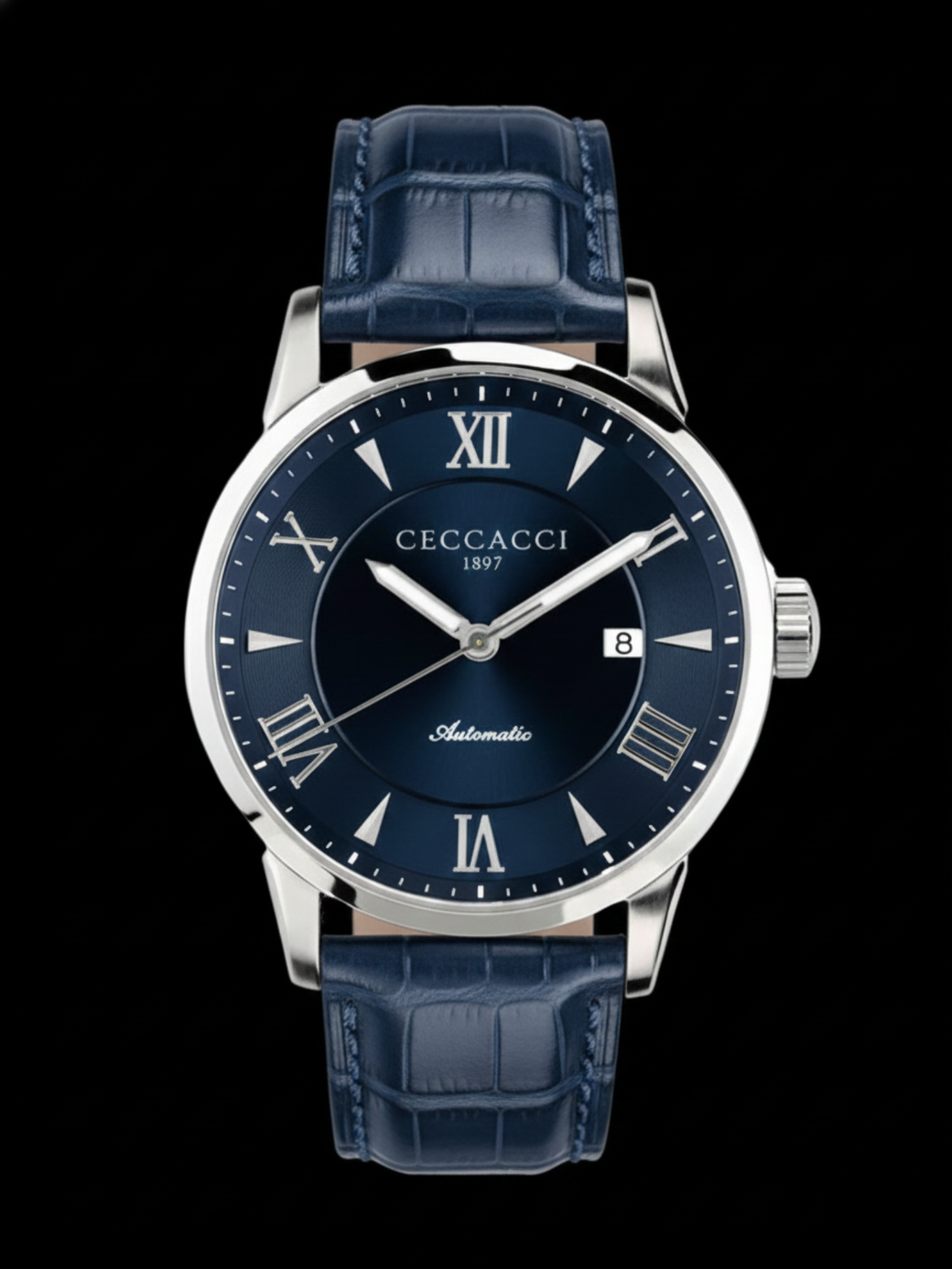 Roman is a refined timepiece crafted for gentlemen who value uncompromising elegance. Its 42 mm case frames a classically inspired dial adorned with Roman numerals, evoking timeless horological tradition. Powered by a precise Swiss automatic movement and paired with a hand-tanned Italian leather strap, it blends mechanical excellence and classical sophistication into a single, impeccably balanced creation.