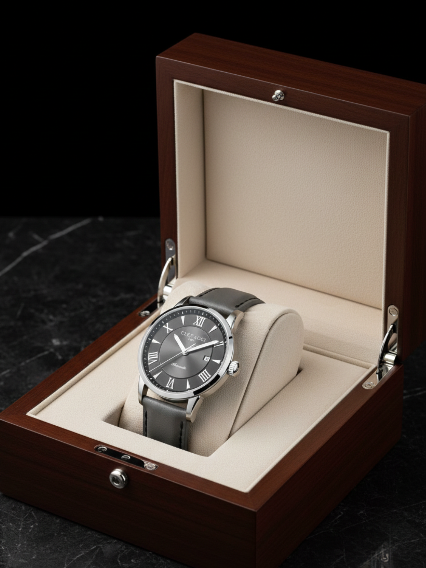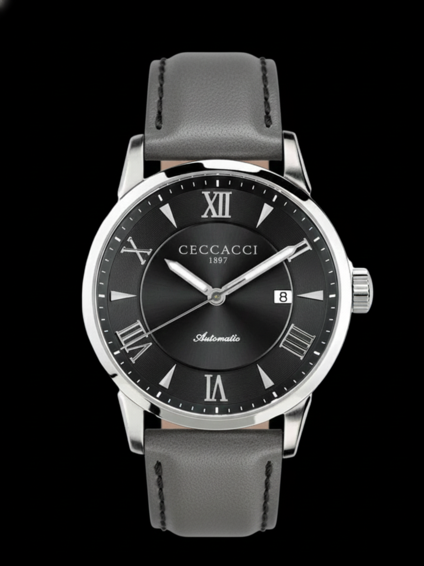 Roman is a refined timepiece crafted for gentlemen who value uncompromising elegance. Its 42 mm case frames a classically inspired dial adorned with Roman numerals, evoking timeless horological tradition. Powered by a precise Swiss automatic movement and paired with a hand-tanned Italian leather strap, it blends mechanical excellence and classical sophistication into a single, impeccably balanced creation.