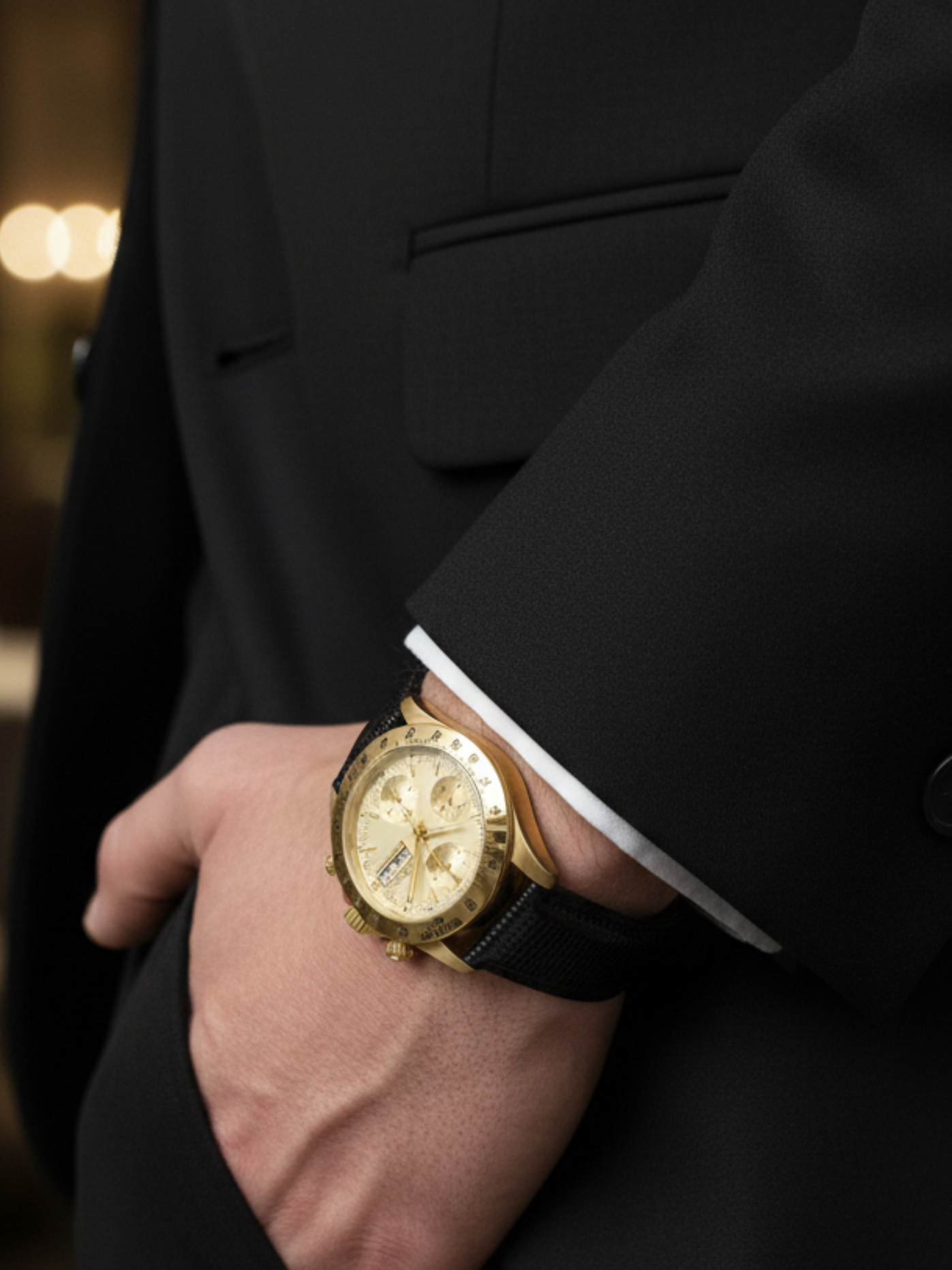 Crafted with timeless devotion to excellence, the Chrono Master stands as a tribute to the golden age of precision and elegance. Encased in a 40.5 mm vintage 18-karat gold body, its form captures both strength and refinement — a masterpiece where sport and sophistication meet in perfect harmony. Beneath its sapphire crystal, the Swiss chronograph movement beats with unwavering accuracy, a heart forged in the tradition of fine horology. Completing its noble character, the hand-tanned Italian leather strap embraces the wrist with warmth and authenticity, each stitch a testament to artisanal mastery. The Chrono Master is not merely a watch; it is an heirloom of motion and grace, a symbol of time rendered eternal.