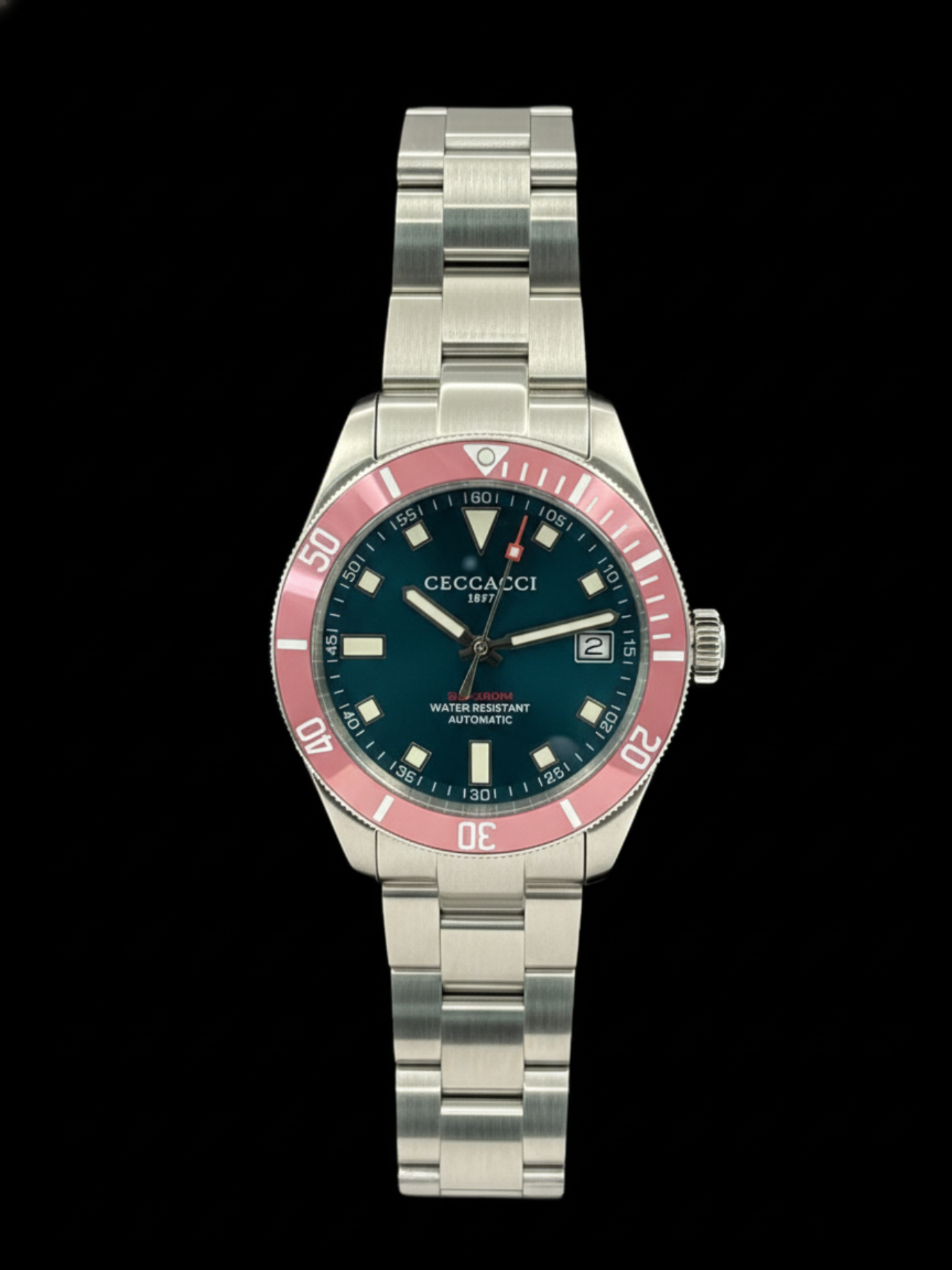 The SCUBA series watch stands as a refined expression of technical mastery and aesthetic distinction, featuring a sleek ceramic bezel and a solid stainless steel bracelet that together convey both strength and sophistication. Engineered to accompany every aquatic adventure with unwavering reliability, it thrives where precision and endurance are essential, moving effortlessly from open seas to refined coastal settings. Free from the need for comparison, it asserts its presence through a rigorously unique design language, where bold character meets elegant restraint, offering not merely performance in water, but an unmistakable statement of style above it.