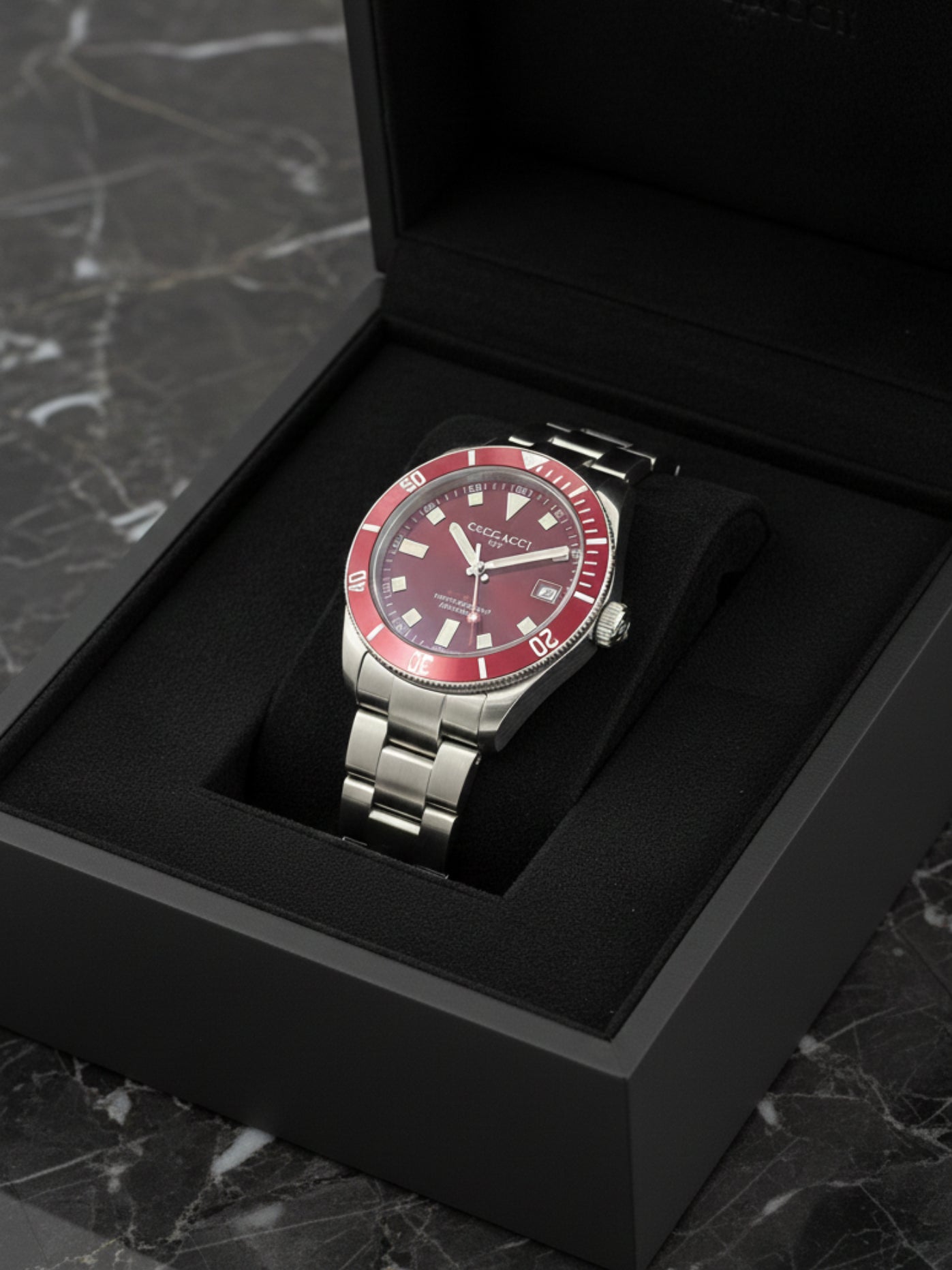The SCUBA series watch stands as a refined expression of technical mastery and aesthetic distinction, featuring a sleek ceramic bezel and a solid stainless steel bracelet that together convey both strength and sophistication. Engineered to accompany every aquatic adventure with unwavering reliability, it thrives where precision and endurance are essential, moving effortlessly from open seas to refined coastal settings. Free from the need for comparison, it asserts its presence through a rigorously unique design language, where bold character meets elegant restraint, offering not merely performance in water, but an unmistakable statement of style above it.